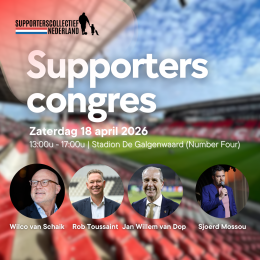 Zet ’m in je agenda: het Supporterscongres 2025/26 vindt plaats op zaterdag 18 april in Stadion Galgenwaard in Utrecht, het stadion van FC Utrecht. Supporterscollectief Nederland brengt die dag supporters, supportersverenigingen en betrokken partners samen om kennis te delen, ervaringen uit te wisselen en te praten over de thema’s die supporters raken.